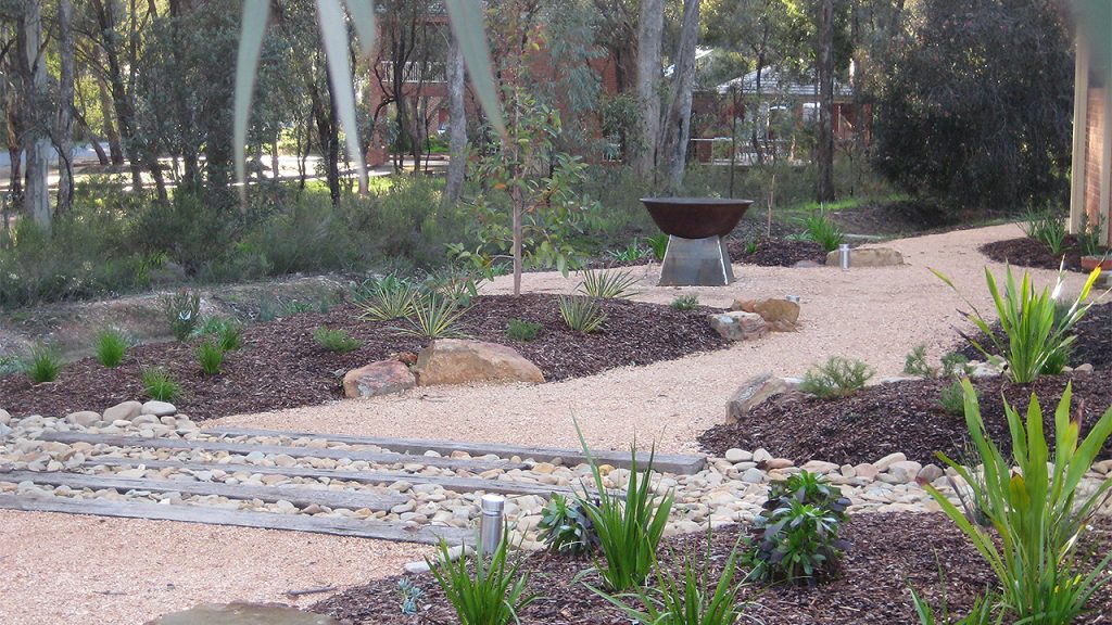 The gardens surrounding the house had been badly affected by the long drought and did not suit its native bush setting. Gravel paths made from recycled bricks created a natural backdrop to raised garden beds with acacias, kangaroo paws, leucadendrons, lomandra and flowering gums just to name a few. A rusted metal fire pit was customised for gathering on chilly nights.